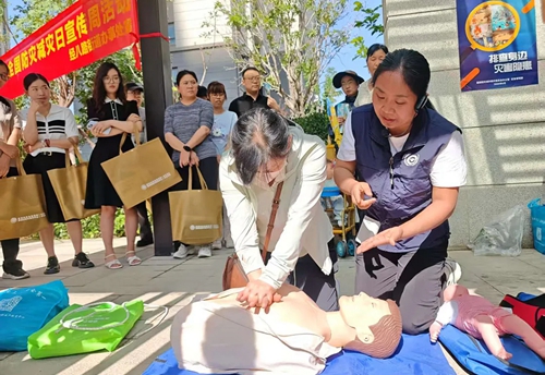在互動體驗環節,工作人員展示結繩演練并指導實操,保障群眾掌握基本結繩逃生技能。現場還設置了仿真人體模型,醫護人員指導群眾進行心肺復蘇操作練習,同時為群眾演示海姆立克急救法操作流程。