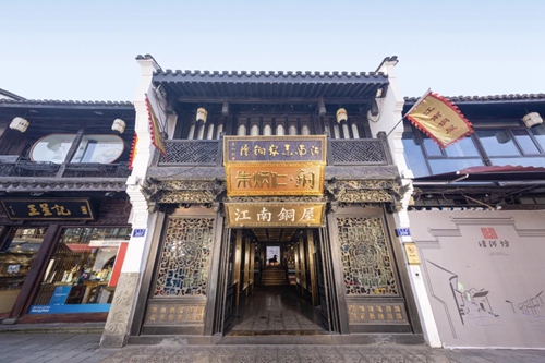 以朱炳仁團隊打造的銅屋系列為例:入駐亳都·新象的“中原銅屋”是其全國第四家、華中第一家銅屋。建筑內(nèi)部以超高、超寬的銅板工藝打造出“銅盒子”視覺焦點,磚木結(jié)構(gòu)搭配著銅與玻璃的碰撞,產(chǎn)生時空交錯的美感。“中原銅屋”整體風格和中原民居相適配,當訪客的指尖掠過帶有紋飾的銅器,恰似完成一場跨越三千年的文明對話——要知道,商城遺址曾出土過杜嶺方鼎等商代青銅文明的巔峰之作,這份地域文化根脈在此得到了呼應(yīng)。